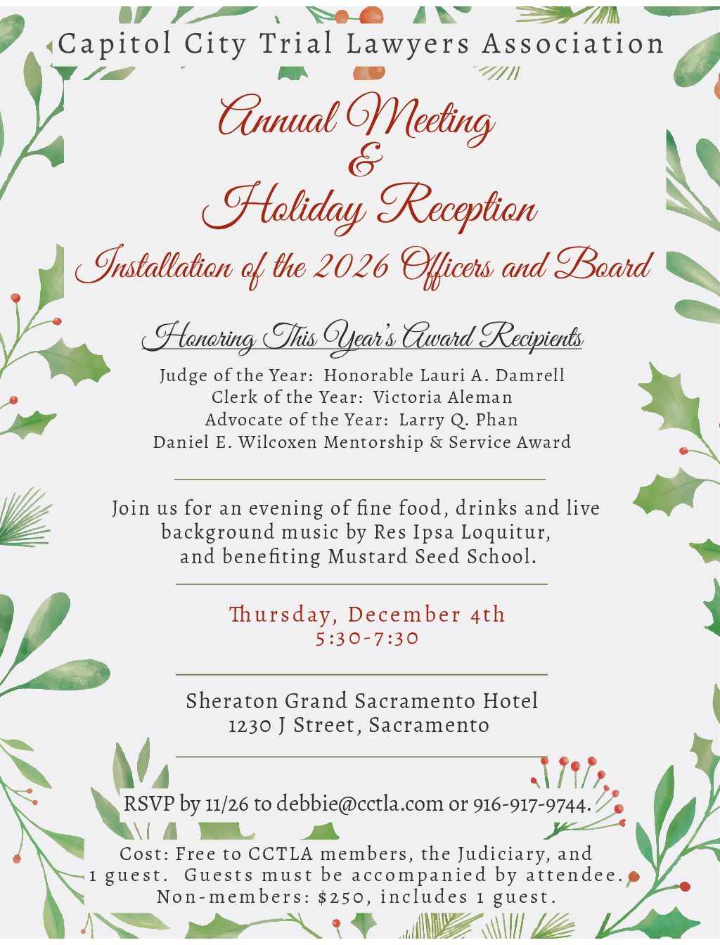 Annual Meeting & Holiday Reception CCTLA will make a holiday donation to Mustard Seed School, and we invite our members to join us in supporting this wonderful cause as part of our annual fundraiser. ♦ ♦ ♦ ♦ ♦ Special Thanks to Our Sponsors! Platinum Sponsors: Dreyer Babich Buccola Wood Campora * Guenard & Bozarth, LLP * ... Read more